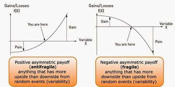因此塔勒布给出了一个衡量是否脆弱的标准 —— 左边的反脆弱类效应发生时,面对波动性的收益大于损失;而右边脆弱类效应发生时,损失大于收益。