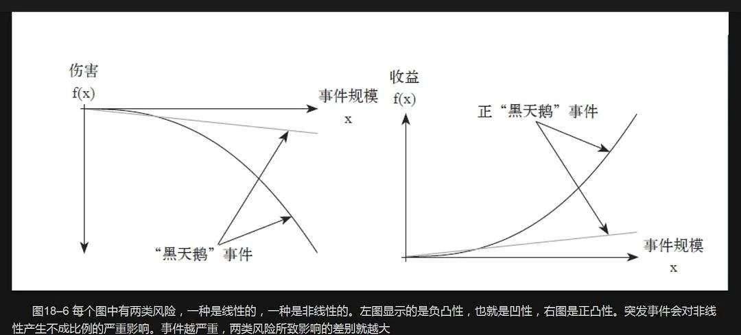 这两个曲线对比更厉害的地方在于,如果遇到难以预料的“黑天鹅”风险,这两类事物获得其中的收益和损失可能都是非线性的。
