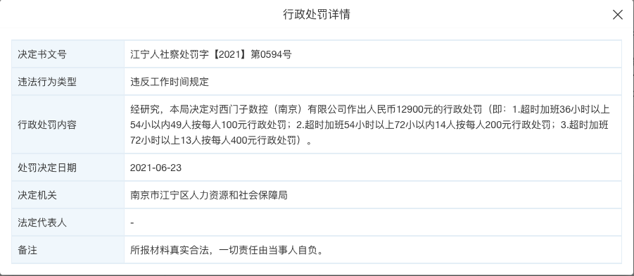 2021年,西门子数控(南京)有限公司因加班问题被有关部门行政处罚,成为了近期因加班被罚款的第一人。在通告中。南京市江宁区有关部门因西门子数控违反了工作时间规定,「76人超时加班」,对其处1.29万元的行政处罚。